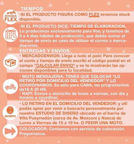 • MOTO MENSAJERIA PERSONALIZADA: Sólo para CABA y GBA, las programamos de un día para el otro en horario que nos indiques. EN ESTE CASO TAMBIEN COLOCAS: LO RETIRO POR DOMICILIO DEL VENDEDOR Y LO COORDINAMOS!