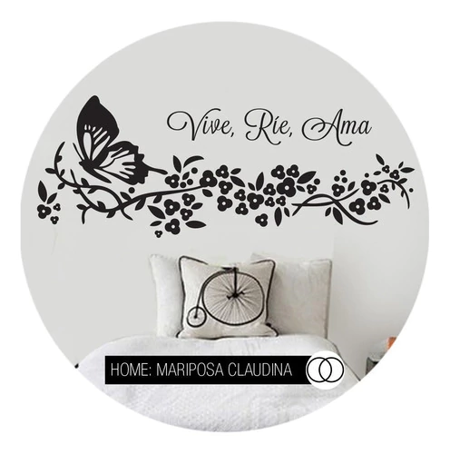VINILO DECORATIVO PARED DORMITORIO RESPALDO CAMA SOMMIER MARIPOSA FLORES Y FRASE: RIE VIVE AMA. IDEAL PARA LA CABECERA DE LA CAMA O SOBRE EL SILLON DE LA SALA. ALEGRA Y RENOVA TU AMBIENTE EN 5 MINUTOS.